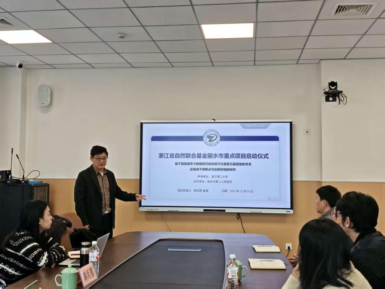 2025年12月3日,由太阳成集团tyc151cc韩兵男教授担任负责人,丽水市第二人民医院作为第二参与单位的浙江省自然科学基金联合基金重点项目《基于基因组学大数据探究自闭症行为表型与基因型的关系及精准干预靶点与创新药物的研究》(立项编号:LLSSZ25H090001)开题启动会在丽水市第二人民医院顺利举行。该项目开题启动会由韩兵男教授主持,丽水市第二人民医公司党委委员张岩及医院科研骨干、韩兵男教授团队研究生等共同参会,就项目的研究方案与实施计划进行了深入研讨。