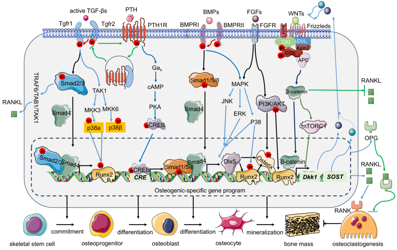 随着分子遗传学、功能基因组学及系统生物学的广泛应用,TGF-β/BMP信号在成骨细胞、软骨细胞、骨细胞及间充质干细胞中的时空调控机制不断被报道。该信号通路与Wnt/β-catenin、MAPK、PTH/PTHrP、FGF、Hedgehog、Notch、IGF/IGFR、mTOR、autophagy等关键信号网络的广泛交叉互作被逐步证实,其分子层面的深度整合共同确保骨骼发育的完整性、协调性与复杂性。