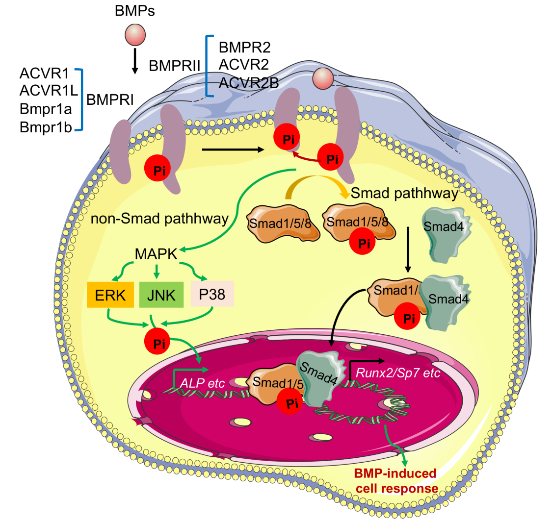 转化生长因子-β(Transforming Growth Factor-β,TGF-β)与骨形态发生蛋白(Bone Morphogenetic Protein,BMP)主要包括经典Smad依赖途径(包括配体、受体及细胞内Smad蛋白)与非经典Smad非依赖途径(如p38 MAPK激酶级联反应),是细胞生命活动的核心调控枢纽,发挥着不可替代的作用。通过精密的分子机制协调成骨分化、软骨形成及骨重塑过程,维持骨稳态进程。