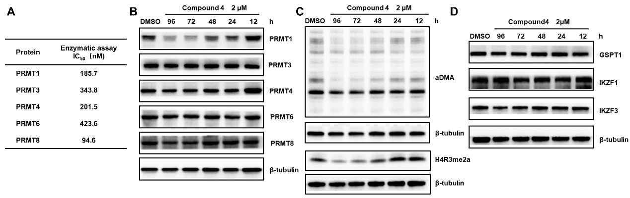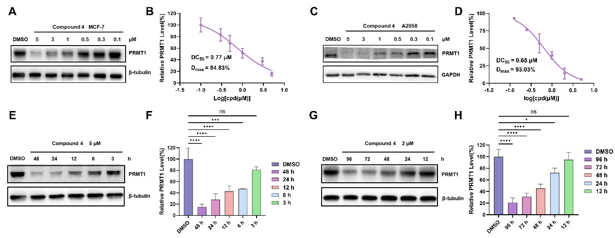 图3. 化合物4触发PRMT1蛋白的剂量和时间依赖性降解。