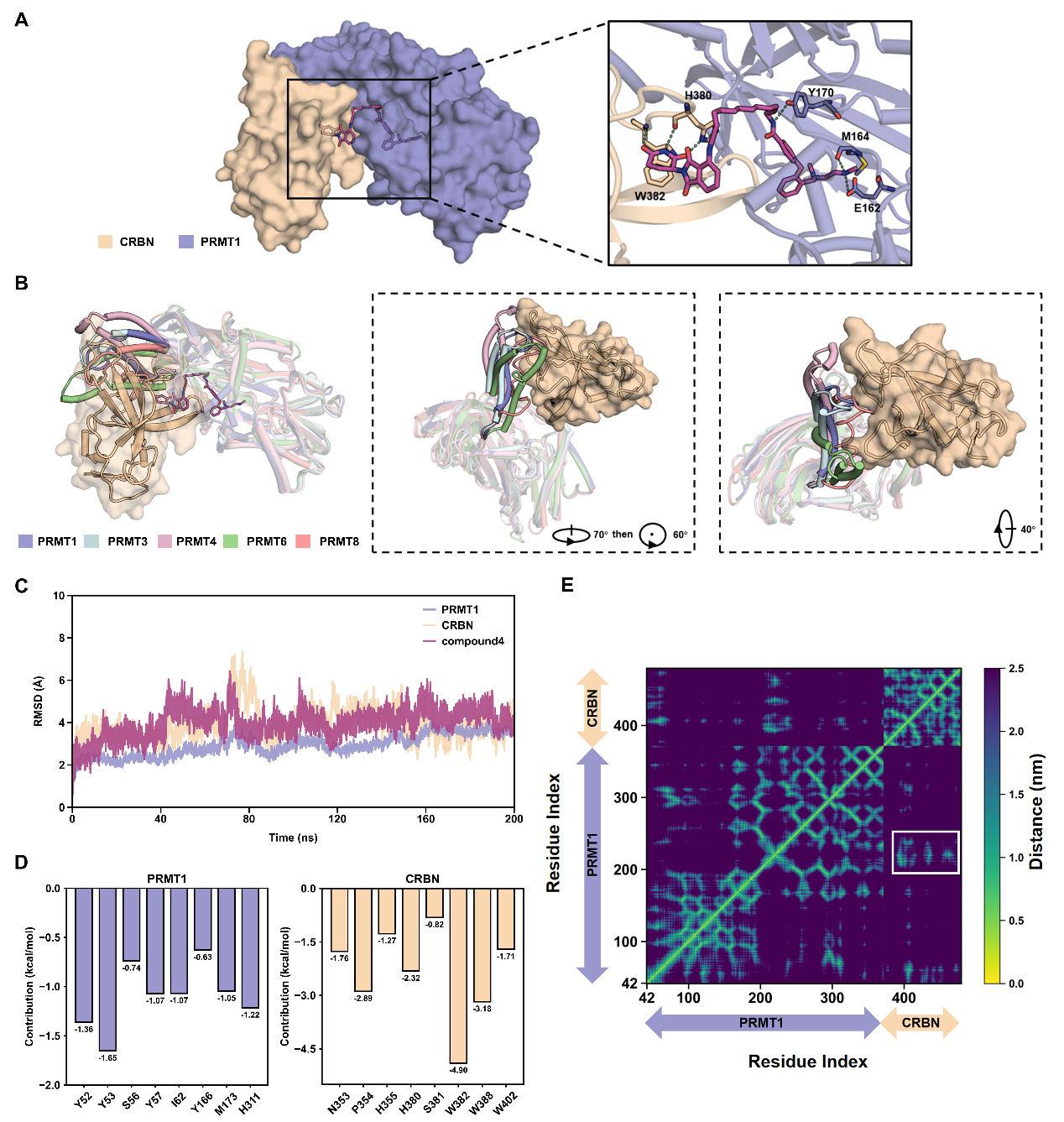 为深入理解PRMT1选择性降解的结构基础,研究团队采用整合计算方法(FRODOCK与RosettaDock联用)构建了PRMT1-化合物4-CRBN E3连接酶三元复合物模型。结果显示,化合物4的靶蛋白弹头有效结合PRMT1底物结合口袋,E3配体朝向二聚化臂相邻的溶剂暴露区域,形成稳定三元复合物。将PRMT1与其他I型PRMTs(PRMT3/4/6/8)结构比对发现,后者的二聚化臂取向和空间排布不利于三元复合物形成,这可能是化合物4选择性降解PRMT1的结构原因。200 ns分子动力学模拟显示各组分达到平衡并保持稳定构象,MM/GBSA计算结合自由能约为-69 kcal/mol;残基能量分解表明PRMT1和CRBN均对配体结合有显著贡献,距离矩阵分析显示PRMT1二聚化臂与CRBN存在频繁相互作用,提示该区域是三元复合物稳定性的关键决定因素。