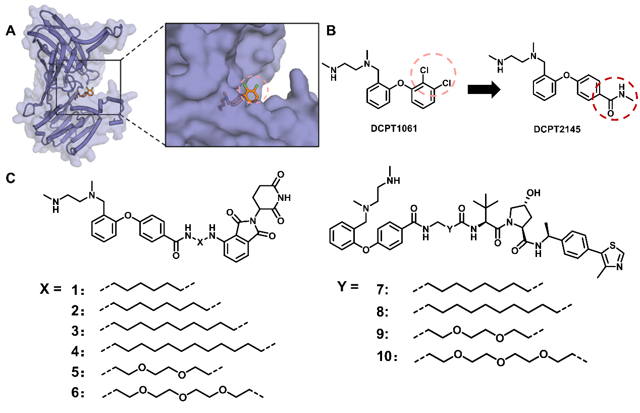 尽管PRMT1已成为重要药物靶点,但现有抑制剂面临选择性差和依赖酶活抑制的局限:早期抑制剂活性较弱,GSK3368715虽进入临床试验却因毒性和疗效问题提前终止。靶向蛋白降解技术通过完全消除靶蛋白的催化和支架功能,有望克服传统抑制剂的不足。鉴于PRMT1还具有酶活性非依赖的功能,开发降解剂将为全面研究其生物学功能提供更优工具。此前将抑制剂与E3配体偶联的尝试未能成功,疏水标签降解剂CM112虽有一定效果,但存在动力学慢、效力中等等问题,且尚无PRMT1 PROTAC降解剂报道。