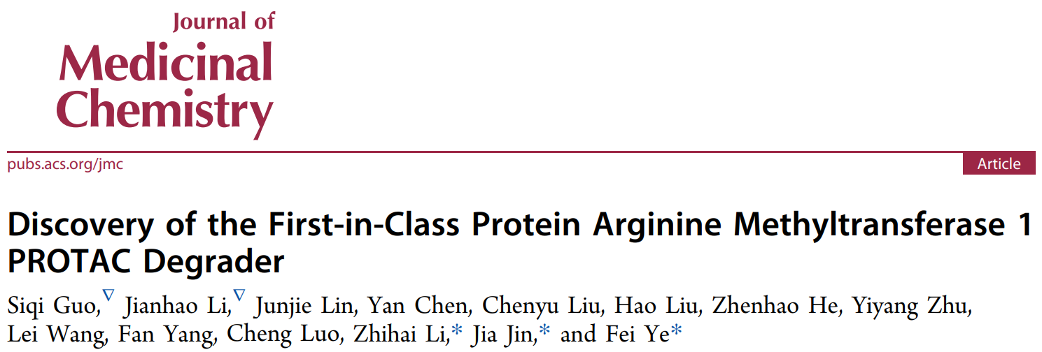 近日,公司叶飞教授团队在新型PRMT1靶向降解剂研究领域取得新进展,成功开发出首个PRMT1 PROTAC降解剂。相关成果以“Discovery of the First-in-Class Protein Arginine Methyltransferase 1 PROTAC Degrader”为题发表于药物化学顶级期刊Journal of Medicinal Chemistry期刊。太阳成集团tyc151cc青年教师郭思岐博士与国科大杭高院硕士研究生李健豪为共同第一作者,叶飞教授、金甲副教授与国科大杭高院为论文李智海研究员为共同通讯作者,公司为第一完成单位。