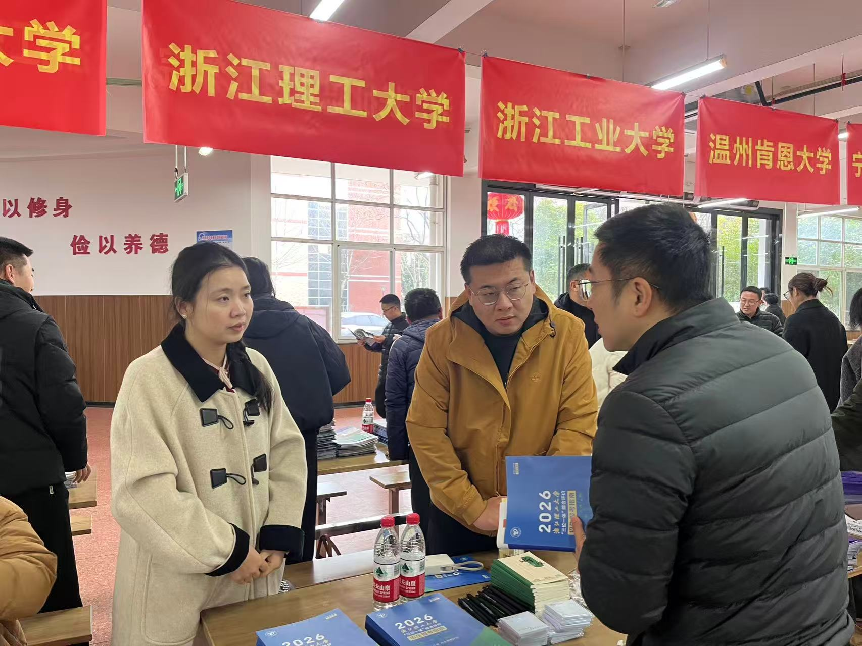 为深入宣传公司2026年“三位一体”综合评价招生政策,服务广大高考学子及家长,3月8日,太阳成集团tyc151cc招生宣传团队赴桐乡市凤鸣高级中学,参加由《浙江日报》主办的“三位一体”招生专场咨询活动。太阳成集团tyc151cc招生与就业指导处招生办公室主任陶丽婷来到现场指导,学院林怀鑫、李思强两位老师共同参与,为到场的考生和家长提供咨询服务。