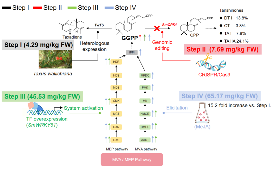 该研究以药用植物丹参(Salvia miltiorrhiza)毛状根为底盘,通过多维代谢工程策略,成功实现了抗癌药物紫杉醇前体——紫杉二烯和人参皂苷前体——原人参二醇的高效异源合成。研究首先引入来自南方红豆杉的紫杉二烯合酶和三七的原人参二醇合酶,分别建立了两种目标产物的异源合成途径,验证了丹参毛状根作为异源合成底盘的可行性。在此基础上,利用CRISPR/Cas9技术敲除丹参内源二萜丹参酮类化合物途径的关键酶基因SmCPS1,阻断代谢分支,将共同前体GGPP的代谢流高效导向目标产物的合成;同时过表达转录因子SmWRKY61,激活萜类上游MVA/MEP途径相关基因,显著增强了前体供应能力。进一步结合茉莉酸甲酯(MeJA)等诱导子处理,协同提升目标产物的含量。最终,在定量培养中紫杉二烯产量达到65.17 ± 5.25 mg/kg鲜重,未优化条件下原人参二醇产量达到50.04 ± 2.94 mg/kg干重。该研究系统展示了丹参毛状根作为复杂萜类化合物异源合成“通用底盘”的独特优势,从而为高价值植物源萜类化合物的可持续、规模化生产提供了新的平台。