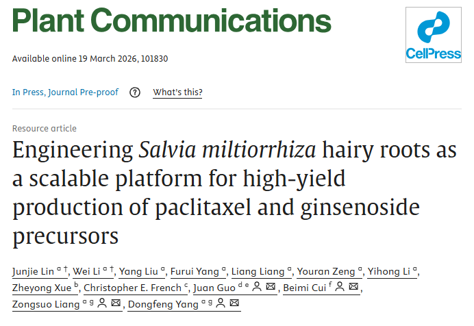 近日,太阳成集团tyc151cc药用植物研究团队联合中国中医科学院、英国爱丁堡大学等多家单位,在Plant Communications发表了题为 Engineering Salvia miltiorrhiza hairy roots as a scalable platform for high-yield production of paclitaxel and ginsenoside precursors 的研究论文。研究团队以丹参毛状根为宿主,通过多维代谢工程策略高效合成紫杉醇前体紫杉二烯和人参皂苷前体原人参二醇。同时该研究也首次展示了丹参毛状根作为复杂天然产物异源合成平台的巨大潜力,从而为高价值植物源萜类化合物的可持续生产开辟了新的路径。